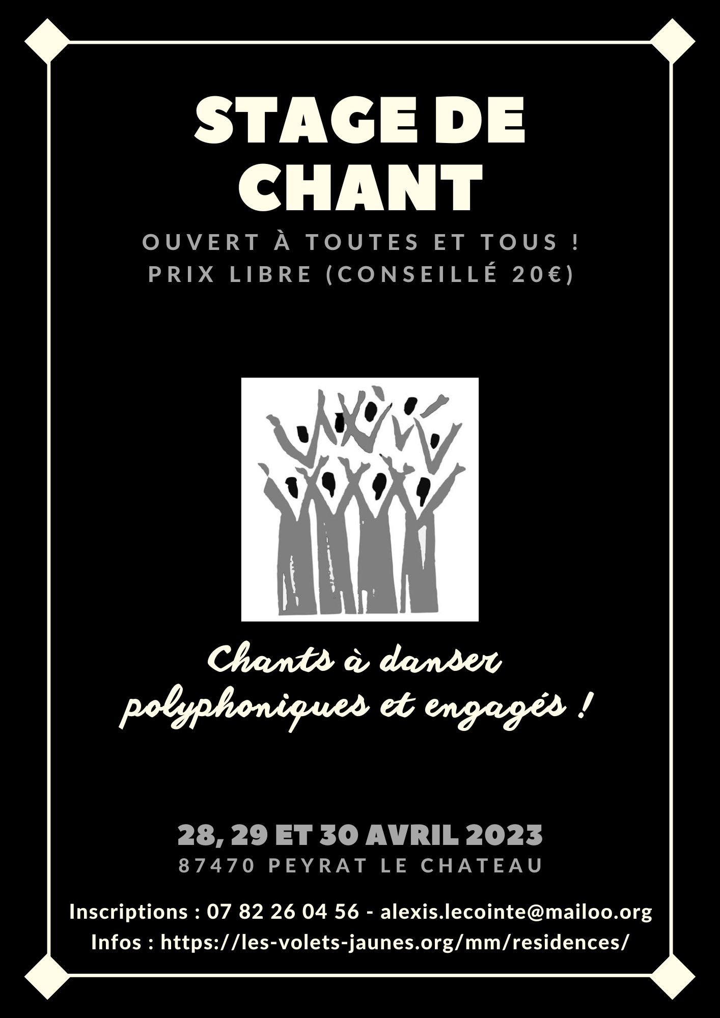 Outils : les participant·e·s repartiront avec un carnet contenant les paroles des chants travaillés lors du stage, et auront égalemente des enregistrements voix par voix de ces chants pour les retravailler par la suite s’iels le souhaitent