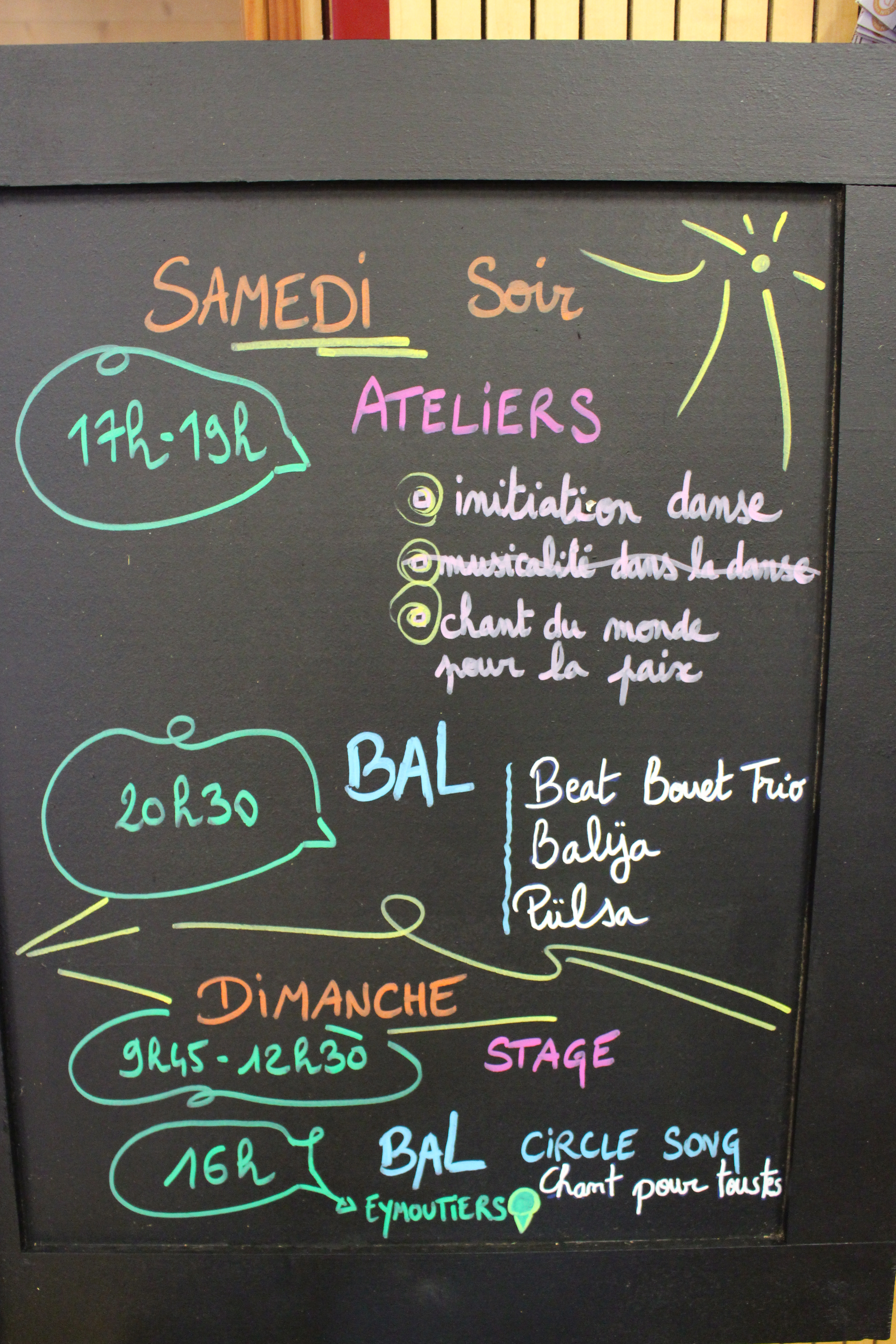 - ATELIERS divers : Lénaïck Bonnet (danse, initiation), Anatole Lorne (danse, approfondissement), Solène Garin (chants du monde)