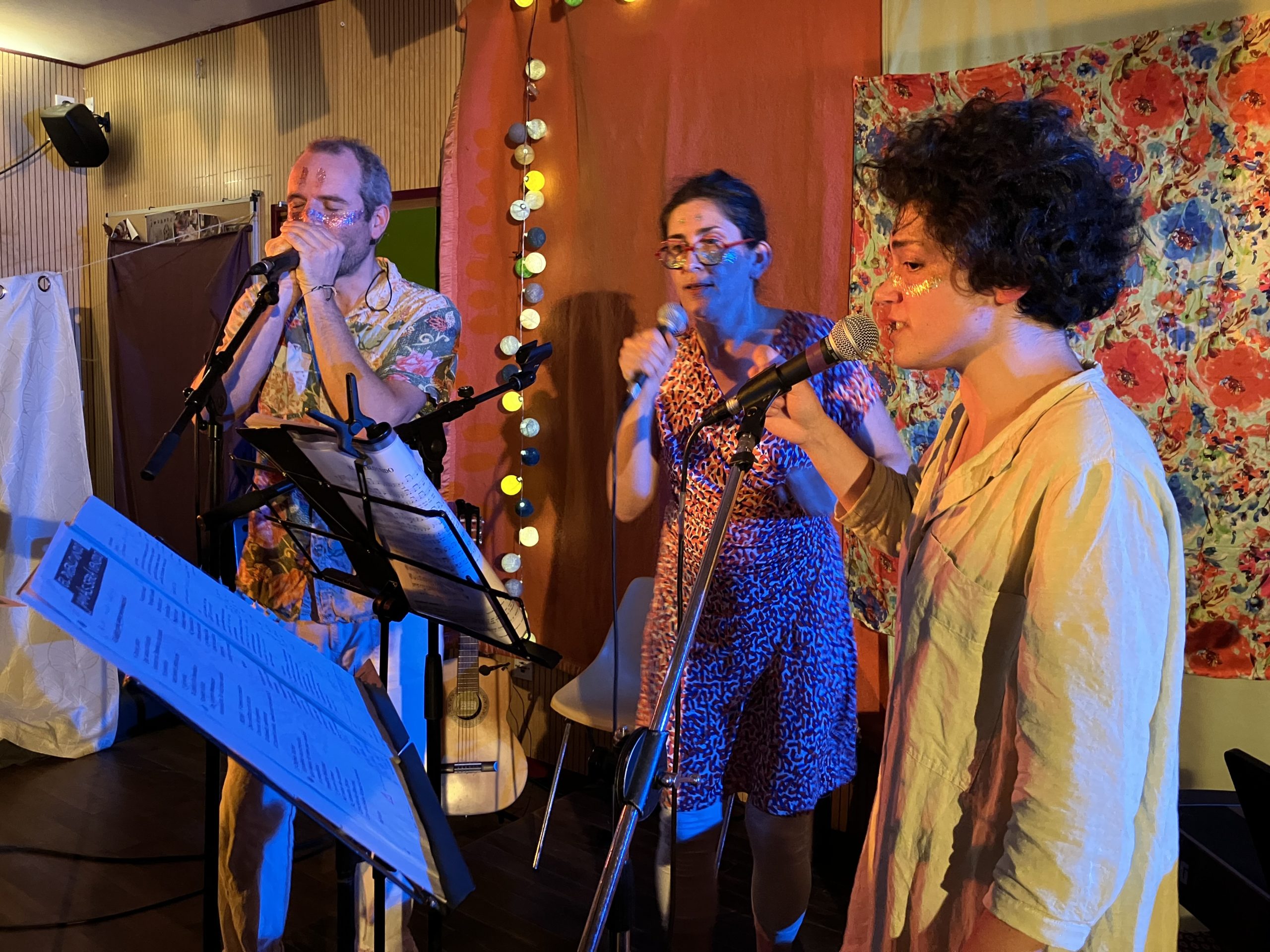 Nous ravirons vos oreilles et ferons fourmiller vos pieds grâce à des mélodies polyphoniques arrangées avec amour, sur des répertories variés : chants révolutionnaires, chansons drôles et poétiques, airs traditionnels revisités, compositions… Pülsa propose un voyage original, inspiré et rythmé dans le monde du bal à la voix, agrémenté de beat box, de percussions et d’instruments variés : cajón, tambour, piano, guitare… Des mazurkas belles à pleurer aux bourrées enflammées, en passant par les mixers à chanter en chœur, c’est avec envie et toutes voix dehors que Pülsa partagera ses émotions avec vous. En laissant la place à l’humour, l’improvisation et la magie de la rencontre du bal. Sous le signe des paillettes bien sûr 😉